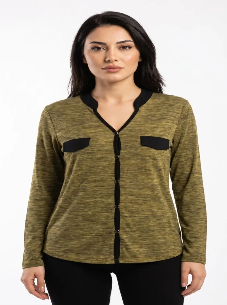 Women’s Olive Green Contrast Trim Button-Front Long Sleeve Shirt