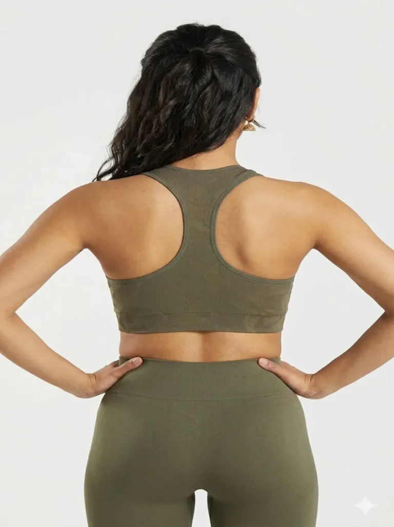 Gymshark Adapt Camo Seamless Lace Up Sports Bra in Savanna Green.